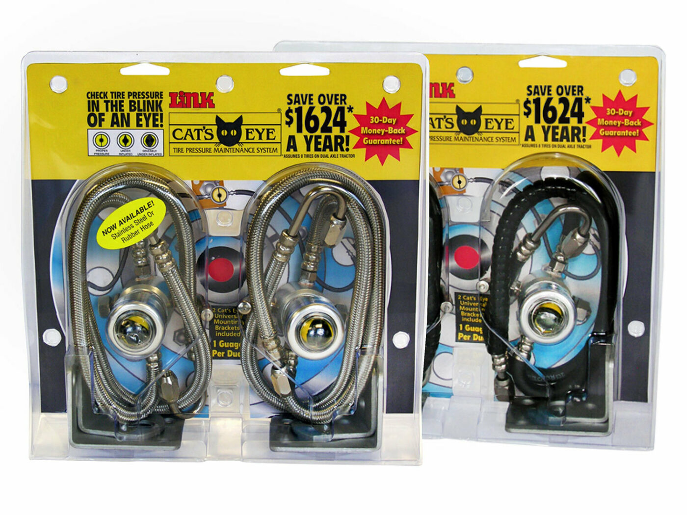 Cat’s Eye is available with rubber or stainless steel hoses. Both hoses are available in lengths of 12’’, 14’’ or 16’’. The packages come with 2 or 4 gauges inside (2 gauges will cover 1 axle).
